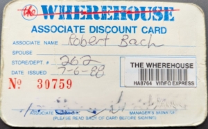 Here it is. My employee ID and rental card from Wherehouse Music, 1988. Yes, in addition to being paid minimum wage, we could also check out VHS tapes at a discounted rate!